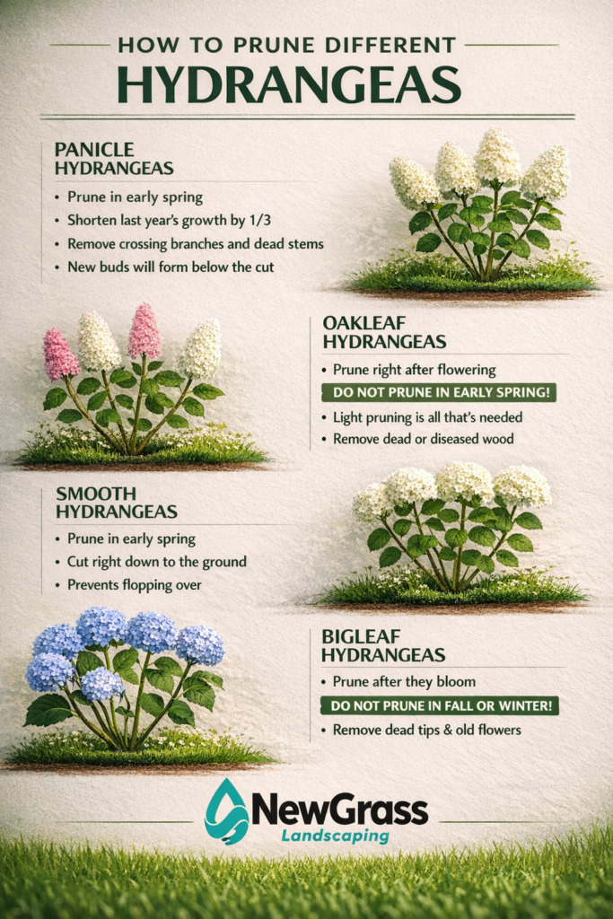 Bigleaf (H. macrophylla)Old WoodRight after flowering (Late Summer)