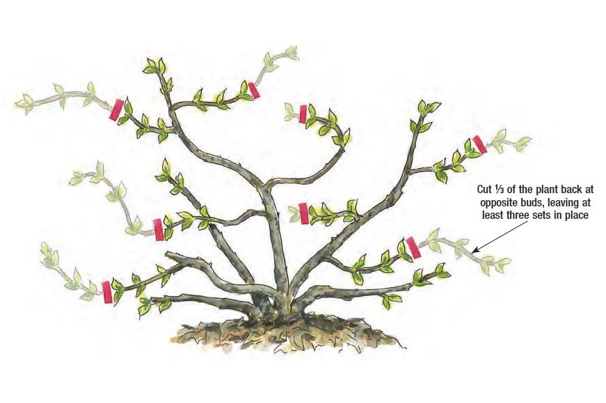 1.Cut Back by One-Third: Reduce the overall size of the shrub by cutting back each branch by about one-third. Always cut just above a pair of healthy buds.